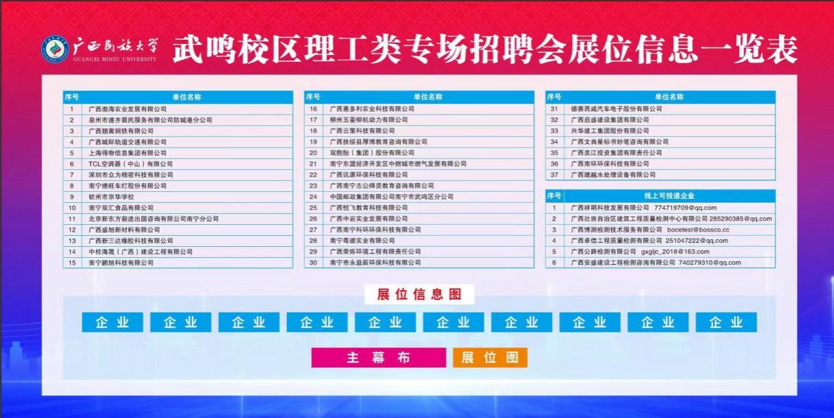 为深入贯彻落实高校毕业生就业工作部署,积极搭建用人单位与毕业生双向选择的平台,切实促进公司毕业生高质量就业。4月15日,j9九游会邀请校外用人单位进校开展ag九游会武鸣校区理工类专业2025届毕业生联合招聘会。本次招聘会设置地点在武鸣校区校前广场右侧一号实验楼一侧长廊。