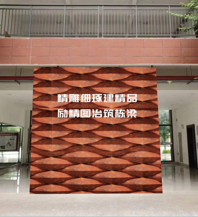 为一楼形象墙进行优化设计,尺寸为480cm×360cm(竖版或横版均可),正面文字内容:j9九游会,背面文字内容:精雕细琢建精品,励精图治筑栋梁,分辨率不低于300dpi,格式为JPG,单幅作品大小不低于20MB。作品需提交源文件。
